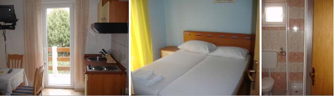 prvi kat, spavaca soba, kuhinja + boravak sa dva dodatna lezaja, kupaona, balkona na sjevernoj strani, tv-sat, parking. |