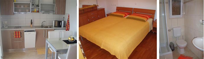 30 m2, drugi kat , kuhinja (mikrovalna pećnica i perilica suđa) s blagovaonom i pomoćnim ležajem, spavaća soba s bračnim krevetom i balkonom, kupaonica s tuš kadom i wc-om, terasa na zapadu, klima uređaj, TV+SAT, DVD. |